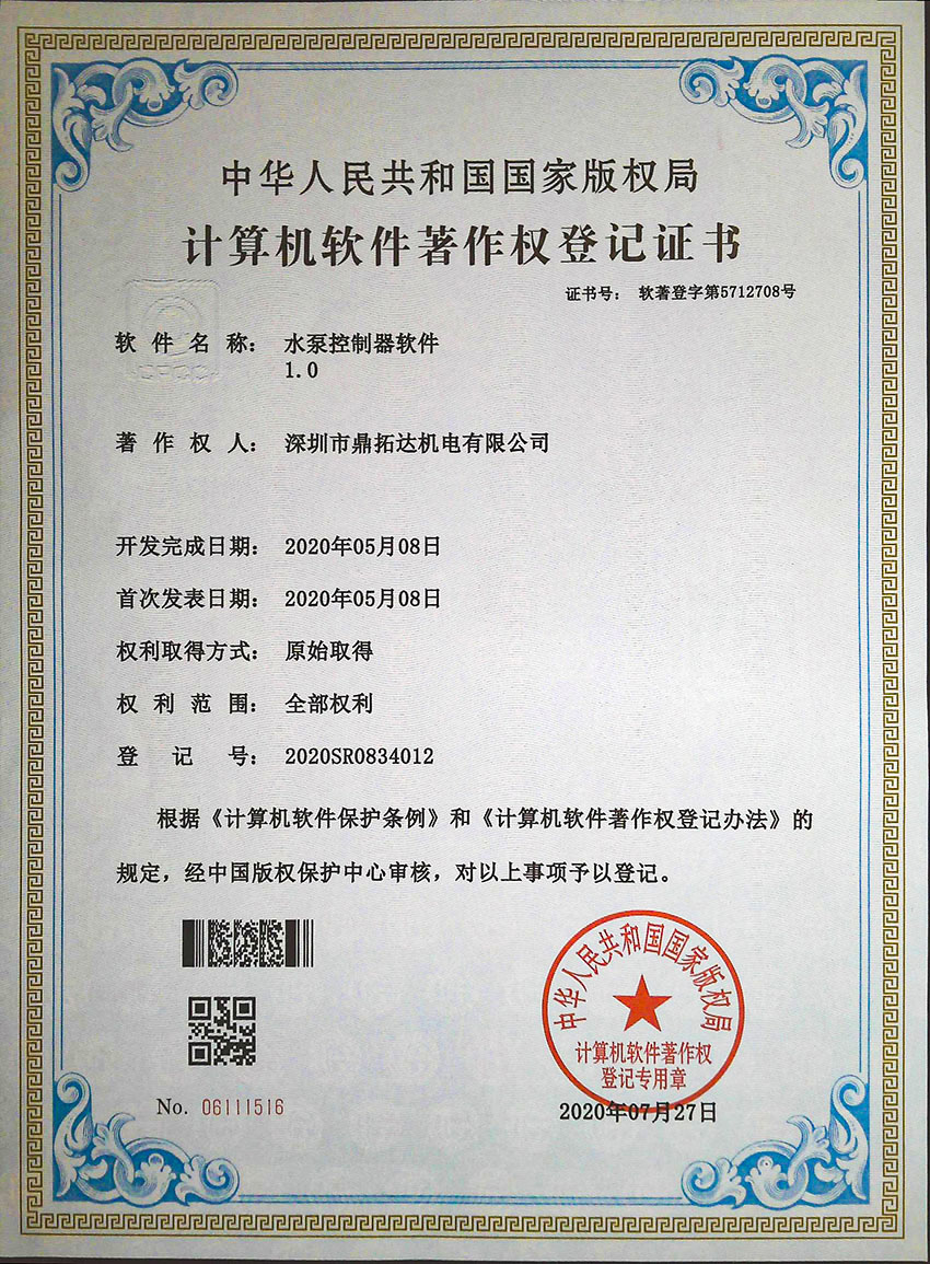 水泵控制器軟件證書(shū)